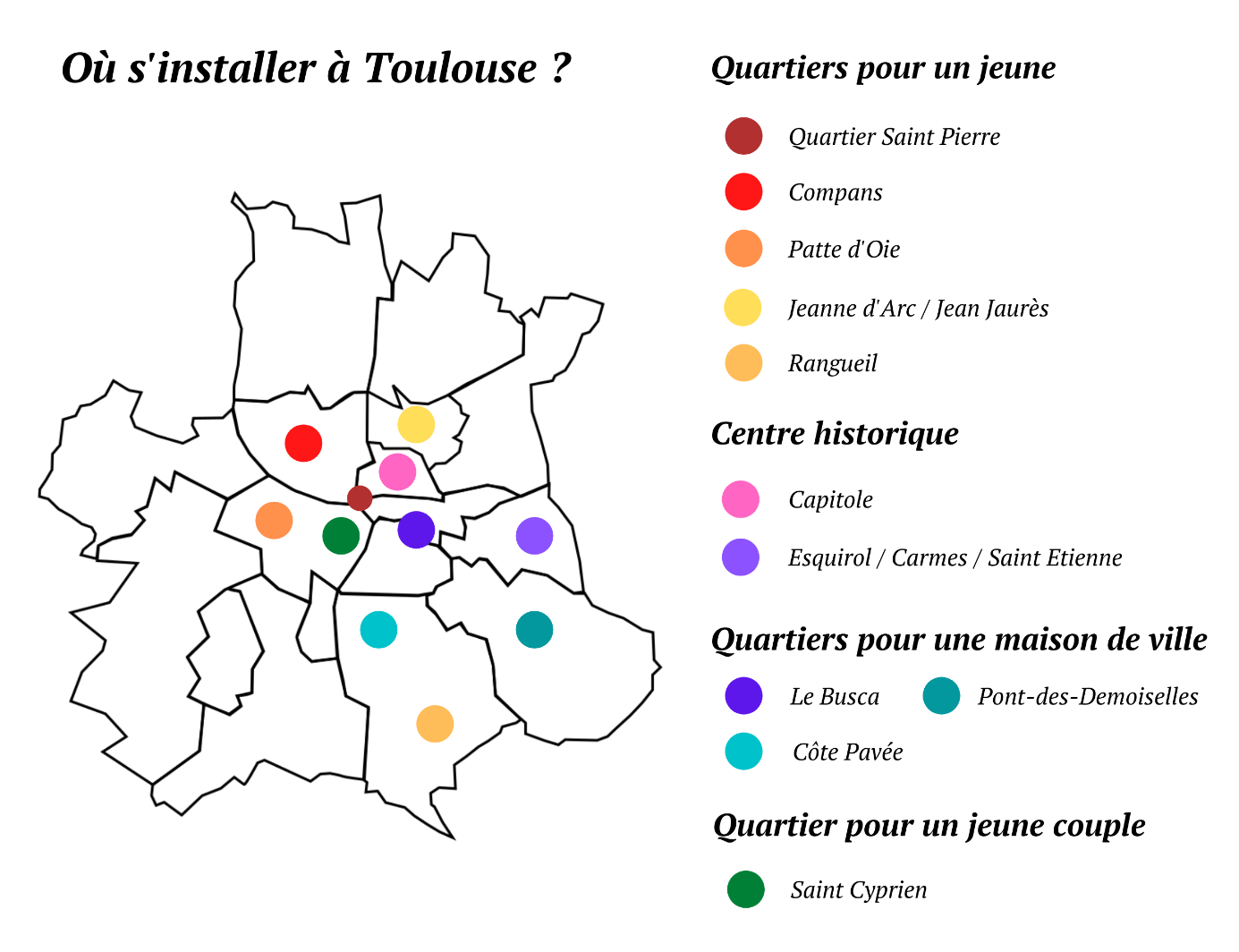 Cette jolie ville avec sa magnifique basilique possède de nombreux petits commerces. Elle est un peu plus éloignée que Blagnac mais il existe une ligne de train jusqu’à la gare de Toulouse, qui est proche du centre-ville.